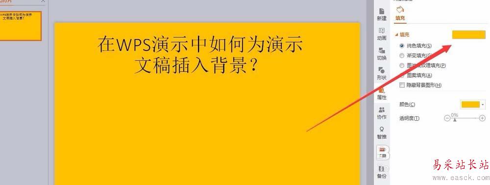 4、在右側出現的對象屬性中,選擇純色填充,選擇一種顏色,比如黃色,如圖所示,背景隨之改變