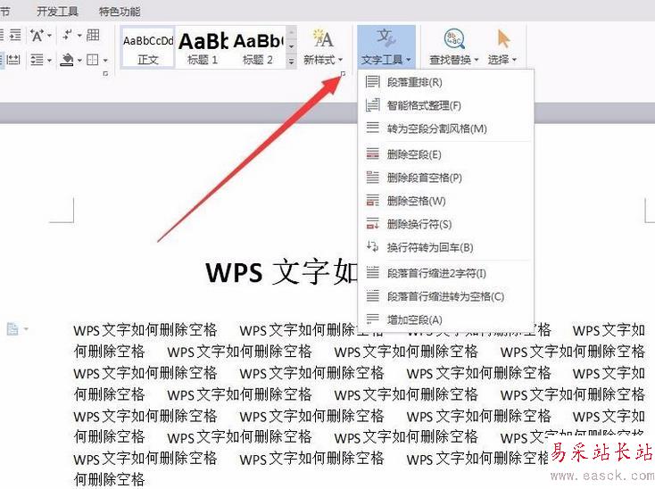 1、在WPS文字中,可以選擇【文字工具】,選擇【文字工具】下的刪除空格,如下圖所示