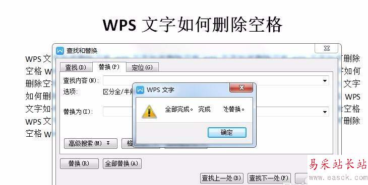 4、在替換窗口中,查找內容輸入空格【 】,替換為設置為空,不輸入任何內容,點擊全部替換,將空格全部替換
