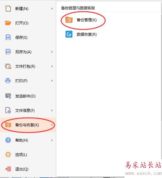 4、關閉上步驟中的選項,點擊ppt左上角”wps演示“——“備份與恢復”——“備份管理"