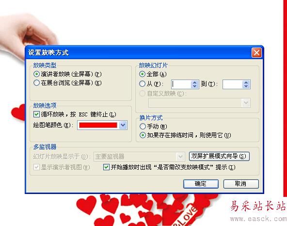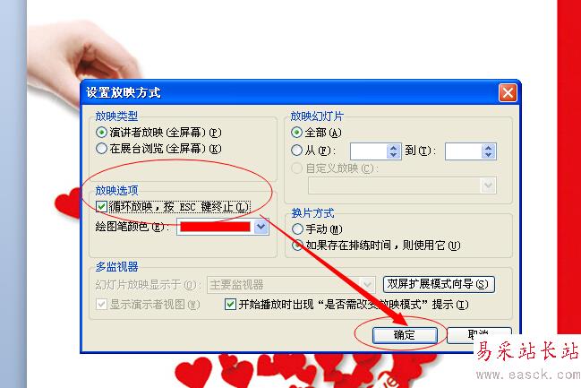 在“放映選項”下面勾選選好放映,按ESC 鍵終止,然后點擊右下角的確定按鈕完成設置并退出