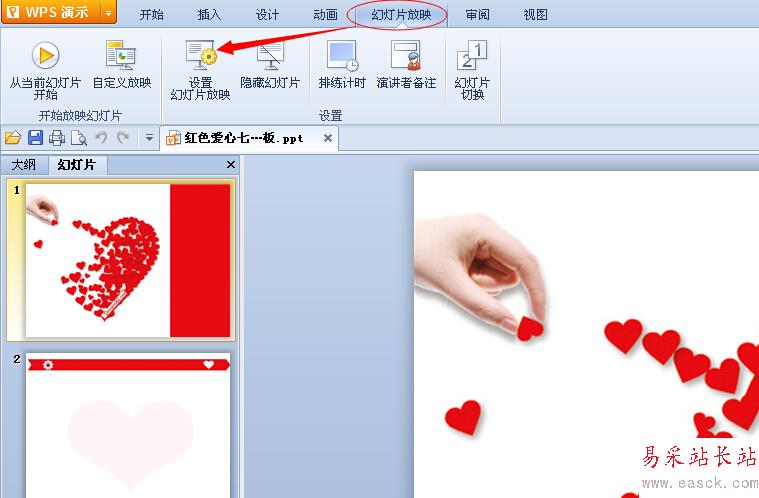 點擊菜單欄中的“幻燈片放映”,打開幻燈片放映設置工具欄,然后在幻燈片工具欄中點擊“設置幻燈片放映”