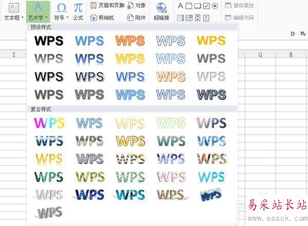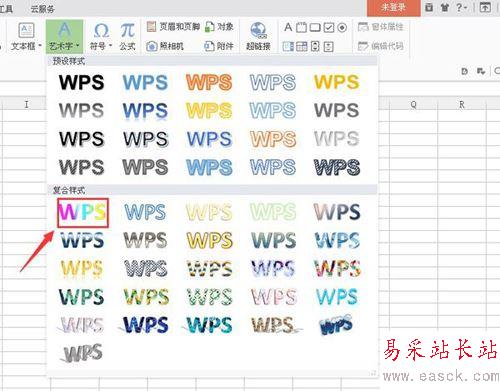 4、點擊藝術字選項,進入其子級菜單區,如圖所示: