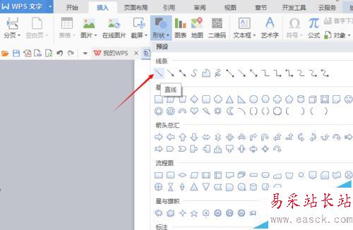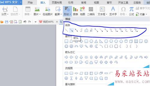 4、接下來(lái)我們需要添加箭頭,添加方法和添加程序框相同,插入>形狀>線條。效果如圖三