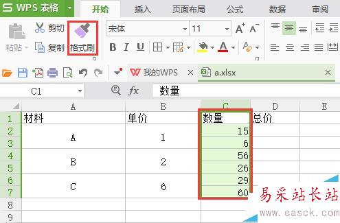 2、選中數量那些單元格,點擊“格式刷”,應用到單價那一列