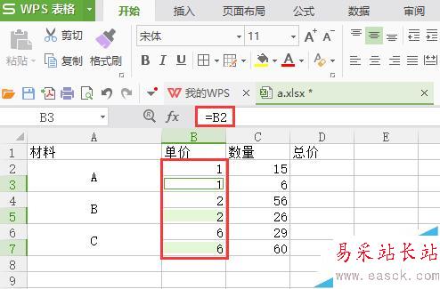 4、在彈出的“定位”對話框中,選擇空值,點擊確定,輸入=B2,單價那些空的單元格也填了值