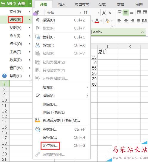 3、選中單價那些單元格,點擊“編輯”->“定位