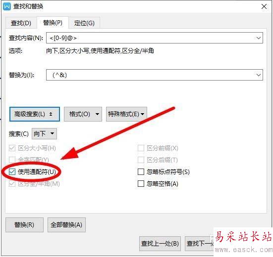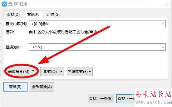 4、在“查找和替換”對話框的“替換”選項卡中的“查找內容”中輸入“<[0-9]@>”。注意外面的大括號和里面的中括號都是在英文狀態下使用鍵盤輸入