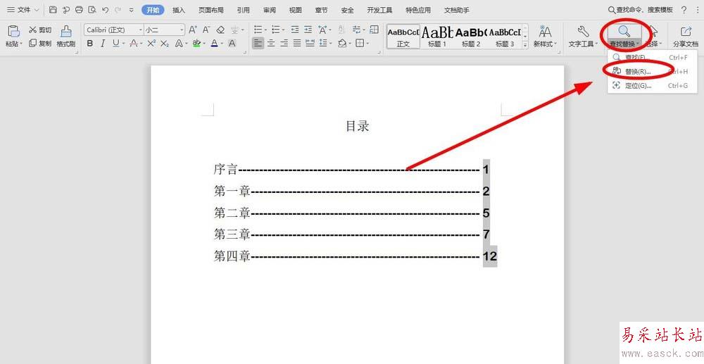 3、找到菜單欄中的“查找和替換”單擊,在下拉菜單選中“替換”