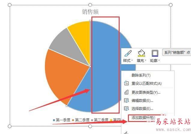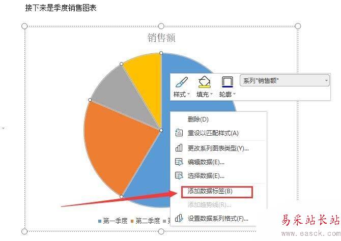 6、也可以單個顯示需要的數據,先選擇任一季度,右擊,彈出的菜單中,選擇“添加數據標簽”,就可以單獨顯示數據了(如下圖)