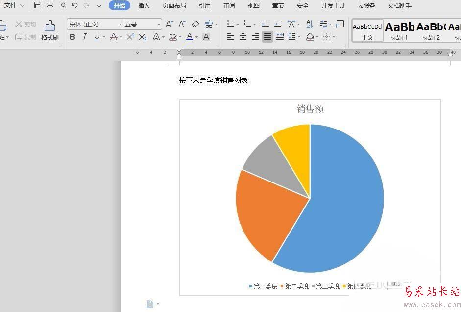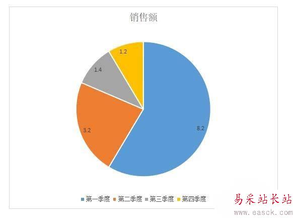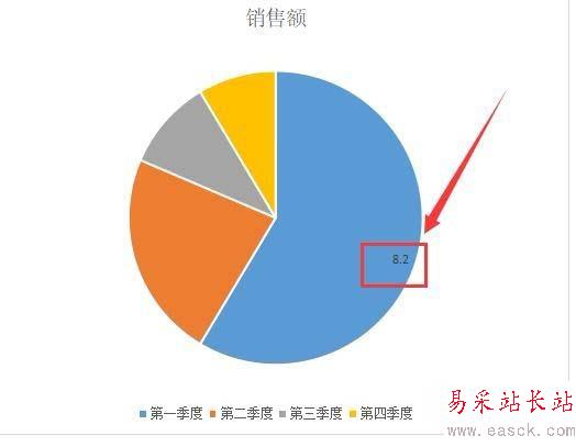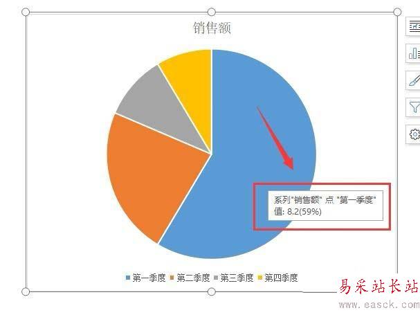 4、文檔中,就會出現餅圖圖形,選中餅圖,然后將鼠標放至在任一顏色框上,就會顯示本季度銷售百分比(如下圖)