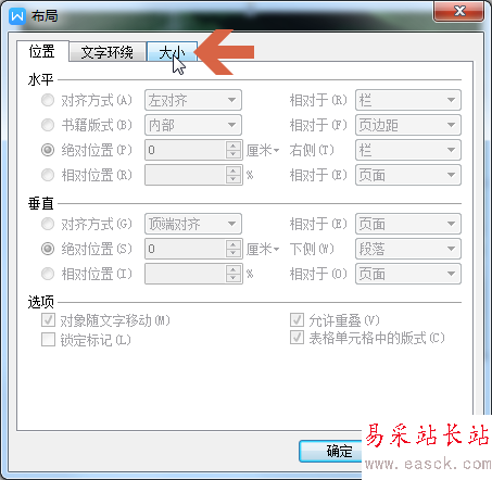 6、打開對話框后,點擊其中的【大小】選項卡。