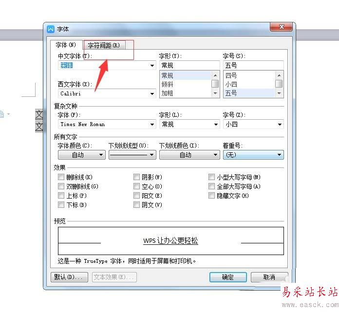 4、在點(diǎn)擊了之后,我們就會(huì)打開字體設(shè)置界面,然后我們需要做的就是將字體切換到字符間距,如圖所示:
