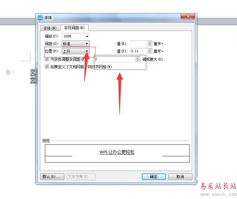 5、在切換到字符間距之后,我們需要做的設(shè)置就是,將位置部分改為上升,下方字體調(diào)整字間距可以調(diào)整為2磅,如圖所示: