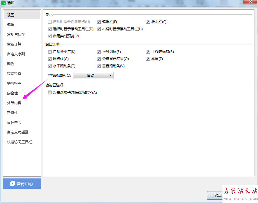 5、【選項】按開下下之后,【外部內容】點觸開,如圖。