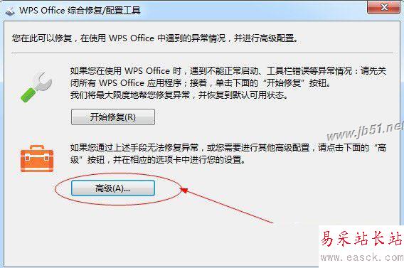 4、進去之后可以看到彈出一個新的對話框【wps office 綜合修復/配置工具】,選擇【高級】;