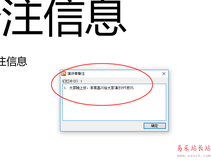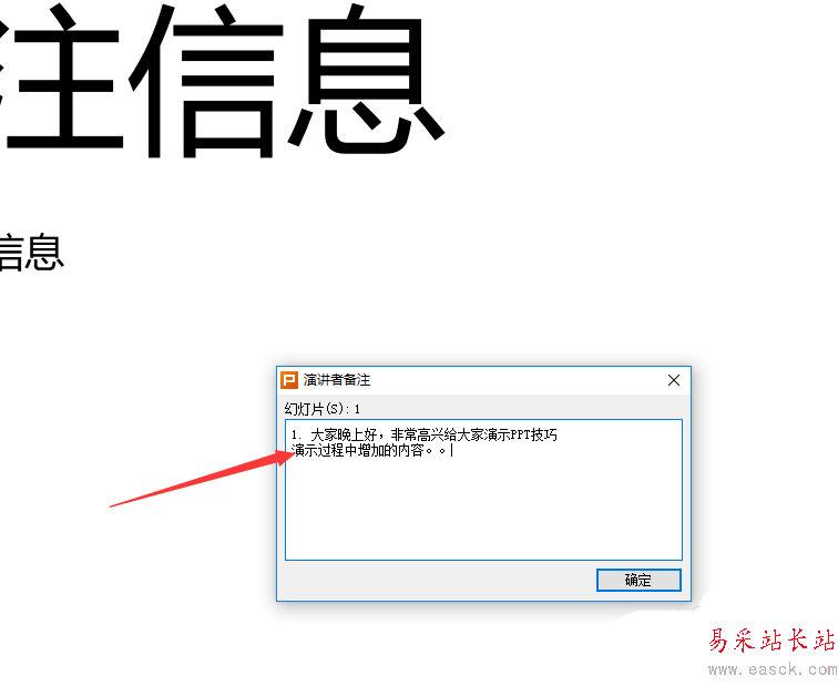 6、修改完之后,然后點擊確定保存退出PPT演示文稿,就可以在備注信息中看到修改的備注內容,