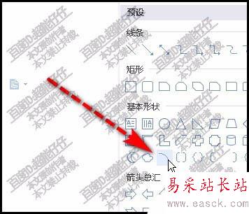 2、再點擊形狀下拉按鈕,彈出所有形狀,找到弧形,再點擊一下,選擇它。