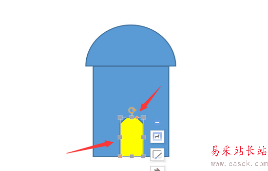 3、使用形狀中的【剪去同側角的矩形】畫出一個小門,放置在如下圖的位置。作為磨坊的大門,這個【剪去同側角的矩形】上面的角是可以調整的,如下圖。同時設置這個大門的顏色為【黃色】。