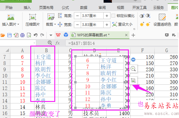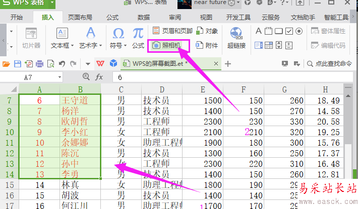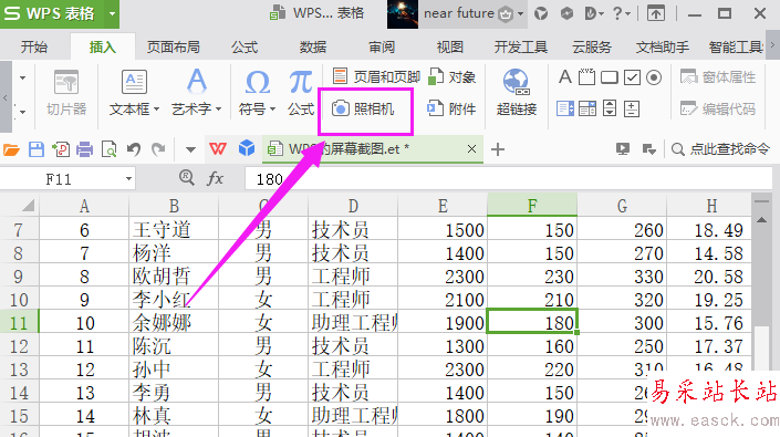 5、上面是WPS屏幕截圖,其實插入命令下,還有一種功能就是照相機功能,也有此功能,只不過截取的內容會隨之原內容而改變,如圖所示