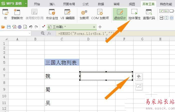6、接著,左鍵選擇列表框空間,單擊【控件屬性】按鈕,如下圖所示。
