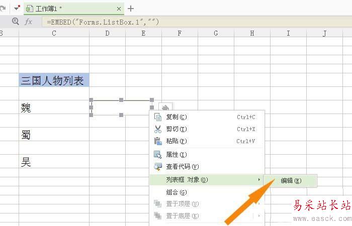 4、接著,鼠標左鍵選擇列表框控件,并單擊右鍵菜單中【列表框對象】下的【編輯】,如下圖所示。