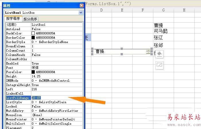 7、然后,在列表框的控件屬性表中,選擇列表數據范圍,如下圖所示。