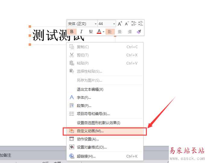 3、我們使用鼠標選中文本框,接著右鍵單擊鼠標,在下拉選項中選擇(自定義動畫)