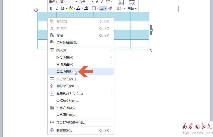 3、再點(diǎn)擊右鍵菜單中的【全選表格】。