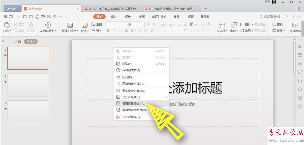 3、文檔創建完成之后,我們在空白處點擊鼠標右鍵,選擇設置背景,如下圖所示,