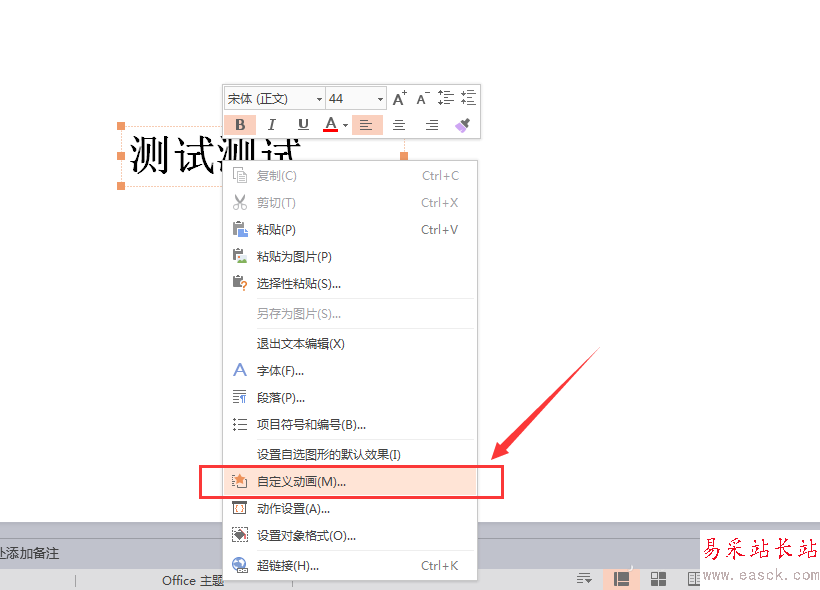 3、我們對(duì)文本框進(jìn)行選中,并且使用鼠標(biāo)右鍵單擊,在下拉選項(xiàng)中,選擇(自定義動(dòng)畫)