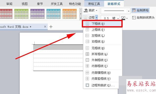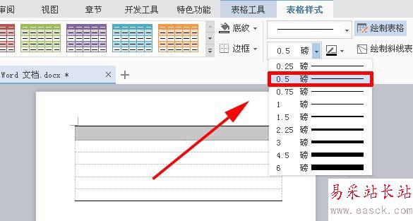 5、選中表格的第一行,把線的粗細改成“0.5磅”,然后點擊“下框線”。