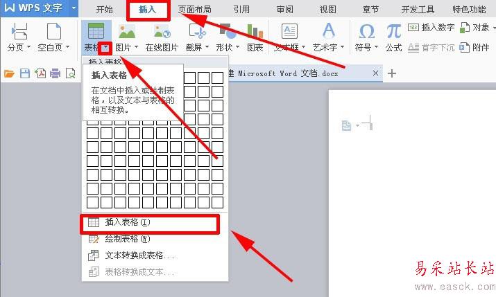 1、打開WPS文字,新建一個文檔。然后點擊工具欄中的“插入”,再點擊“表格”右邊的小箭頭,再點擊“插入表格”,并根據自己的需要設置表格列數、行數。