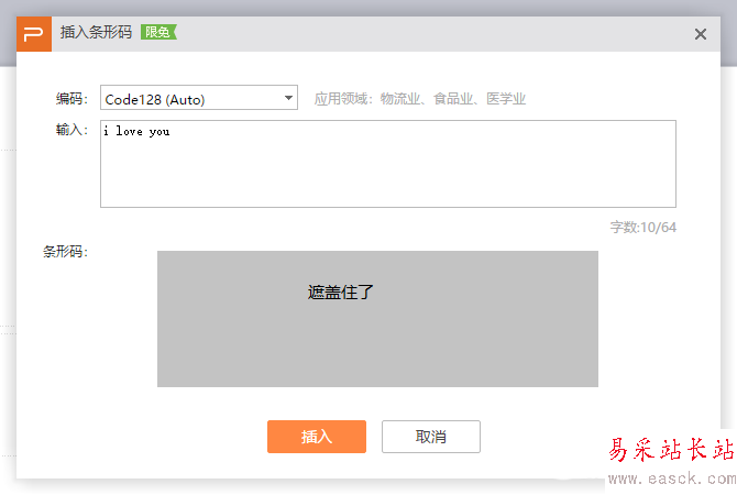 7、點擊插入,即可生成條形碼。另外我們可以打印出條形碼,貼在書后,可以進行出其不意的告白哦。