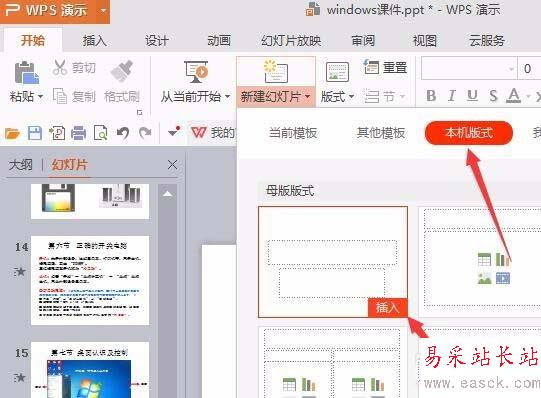 方法三:點擊開始選項卡,在功能區中找到新建幻燈片點擊,彈出模板選擇,對著需要的模板右下角的插入點擊就可以了。