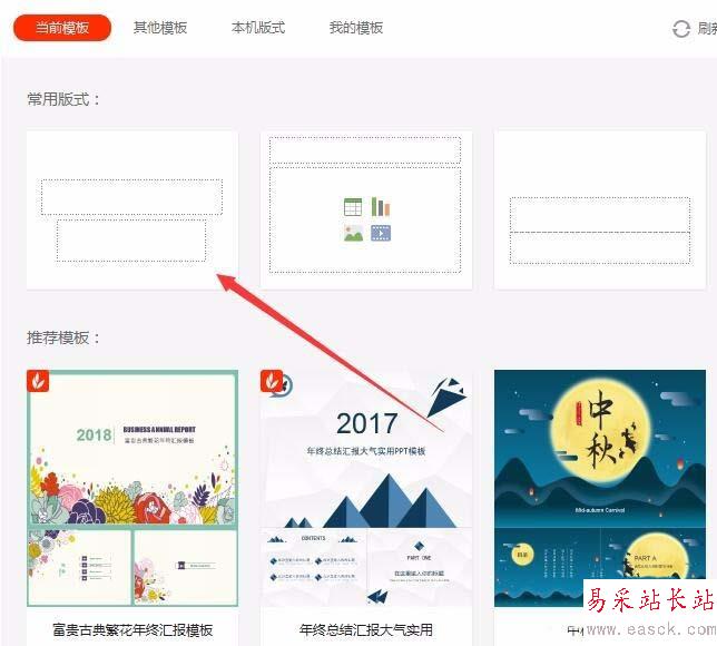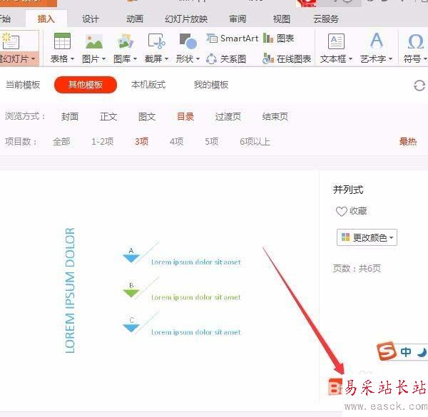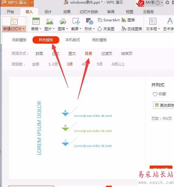同樣彈出模板供選擇,比如選擇其他模板,再選擇目錄的瀏覽方式,選擇項目數為3項。最后點擊右側插入此頁選項就可以了。
