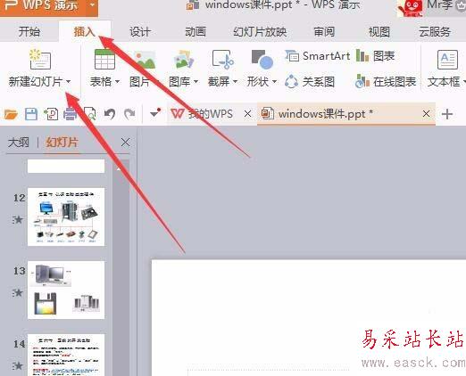 方法四:點擊插入選項卡,在功能區中點擊第一個按鈕新建幻燈片。