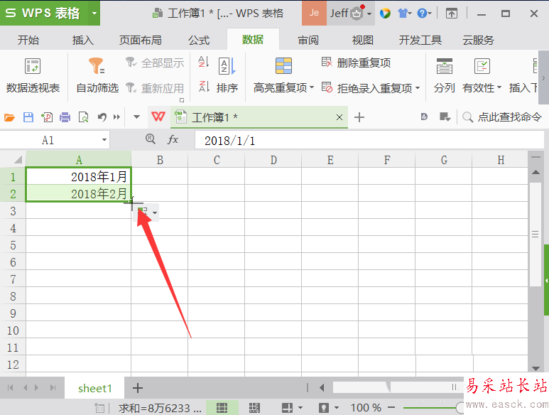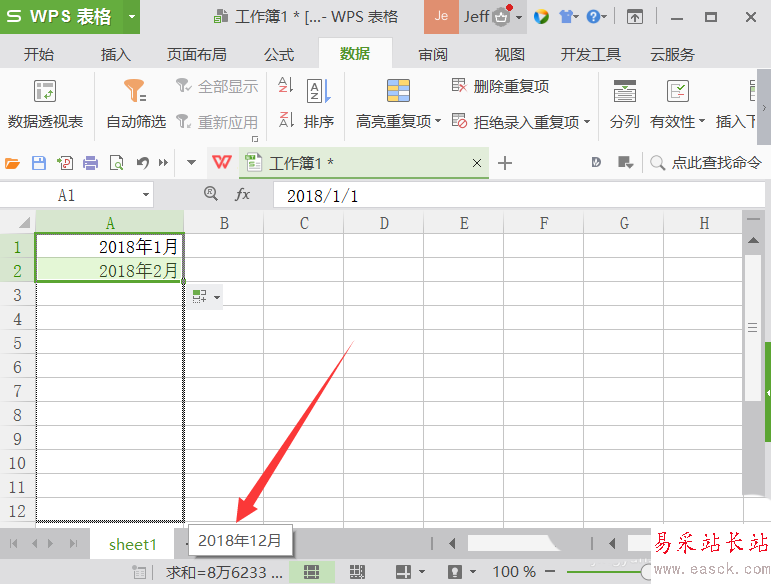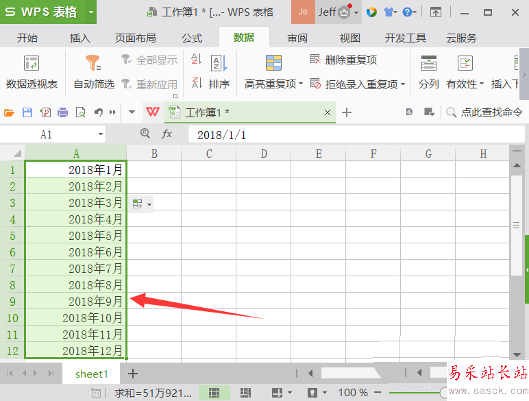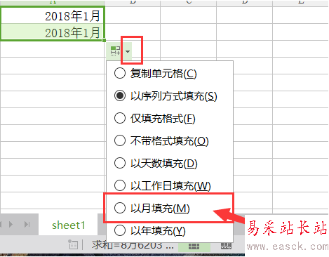 2、如果按常規(guī)一個(gè)一個(gè)輸入時(shí)可以的,但是效率低點(diǎn)。如果直接輸入第一個(gè)2018年1月,然后按住鼠標(biāo)拖動(dòng),會(huì)出現(xiàn)如下效果,顯然沒(méi)有達(dá)到效果。