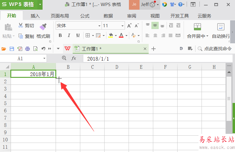 3、那我們換個(gè)方向,在第一個(gè)單元格中輸入 2018年1月,當(dāng)鼠標(biāo)移動(dòng)到單元格右下角出現(xiàn) + 時(shí)按住鼠標(biāo)向下拖動(dòng),到位置之后松開(kāi),可以直接到12行,或者就到第二行