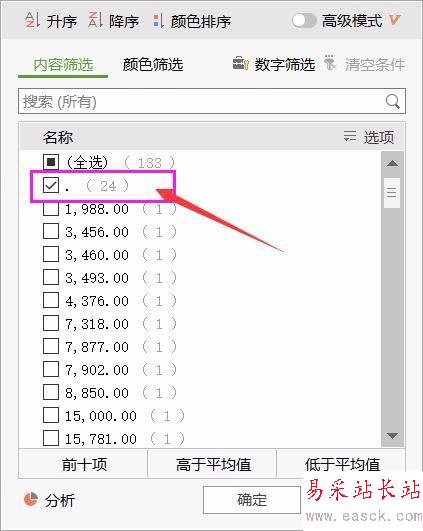 5、單擊【確定】按鈕后,所有包含【.】的行次都被篩選出來,如下圖所示: