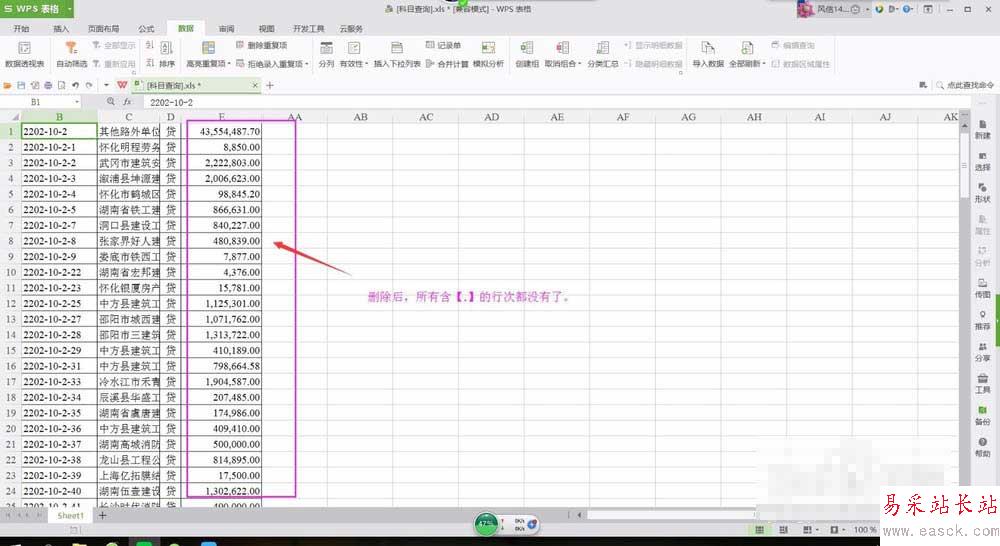 9、當所有被篩選出來的含【.】行次被刪除,表格中不再有含【.】的行次了。如下圖所示: