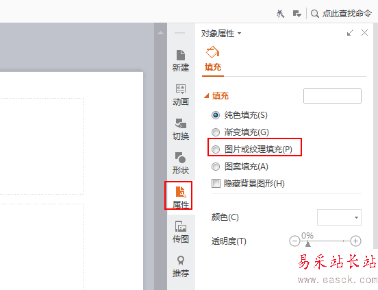 4、在右側(cè)屬性欄中點擊“圖片或紋理填充”選項。