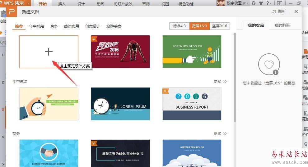 1、打開WPS演示文稿版本PPT軟件,新建一個寬屏為16:9比例空白文檔,如圖