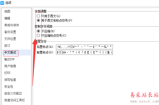 5、找到中文板式---只壓縮標點符號,勾選這個命令,點擊確定。這樣的話就可以避免再次使用文檔出現問題了。