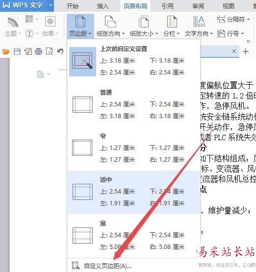 2、在打開的頁面布局工具欄上點擊“頁邊距”按鈕,在彈出的下拉菜單中點擊“自定義頁邊距”快捷鏈接。