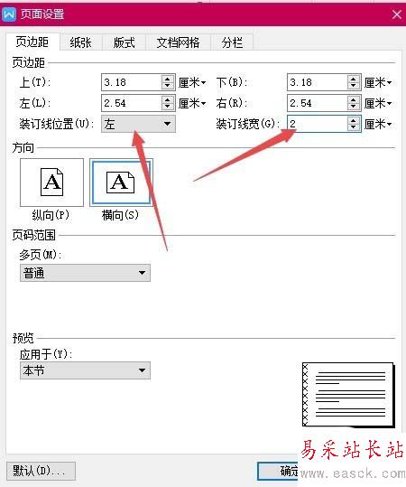 3、這時就會打開頁面設置窗口,在這里設置裝訂的位置為“左”,接著設置裝訂線寬為2厘米。