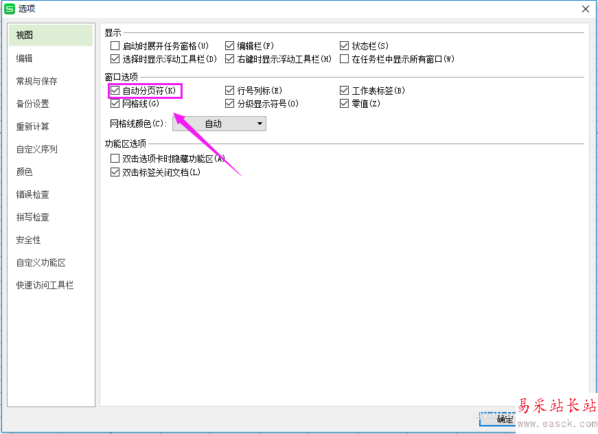 5、我們找到自動分頁符,把那個勾取消掉,如圖。