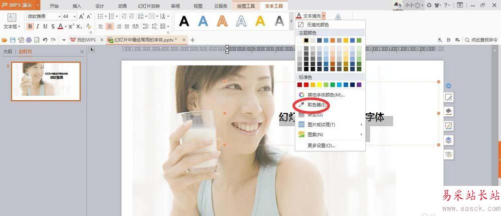2、選中文本框里的文字。點擊上方的文本填充。點擊像吸管一樣的取色器。