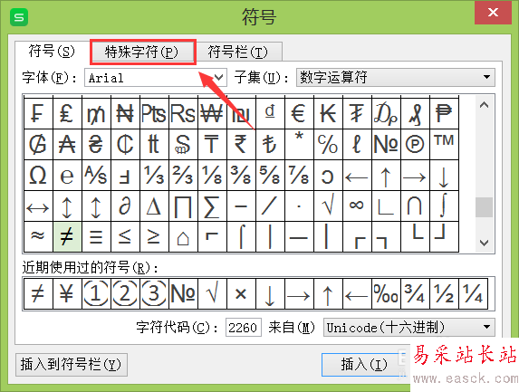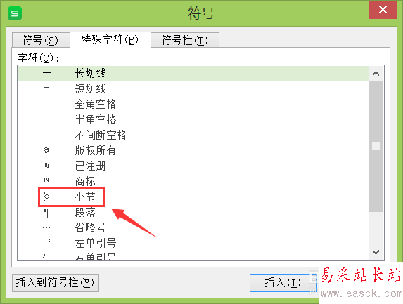 6、點擊特殊字符選項,在其內找到小節符號選項,如圖所示:
