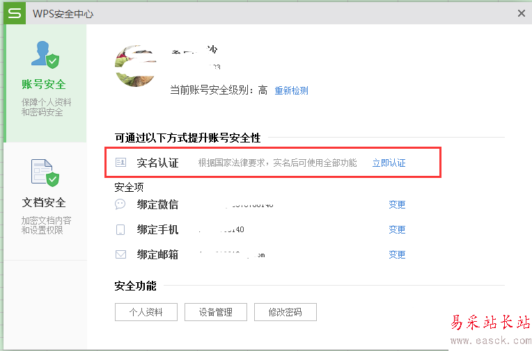 4、在賬號的wps安全中心里??梢钥吹轿业馁~號安全級別是高。我綁定了微信,手機(jī)和郵箱,能增加安全性。說是實名制后可以使用全部功能。所以在這里可以進(jìn)行實名認(rèn)證,選擇立即認(rèn)證。